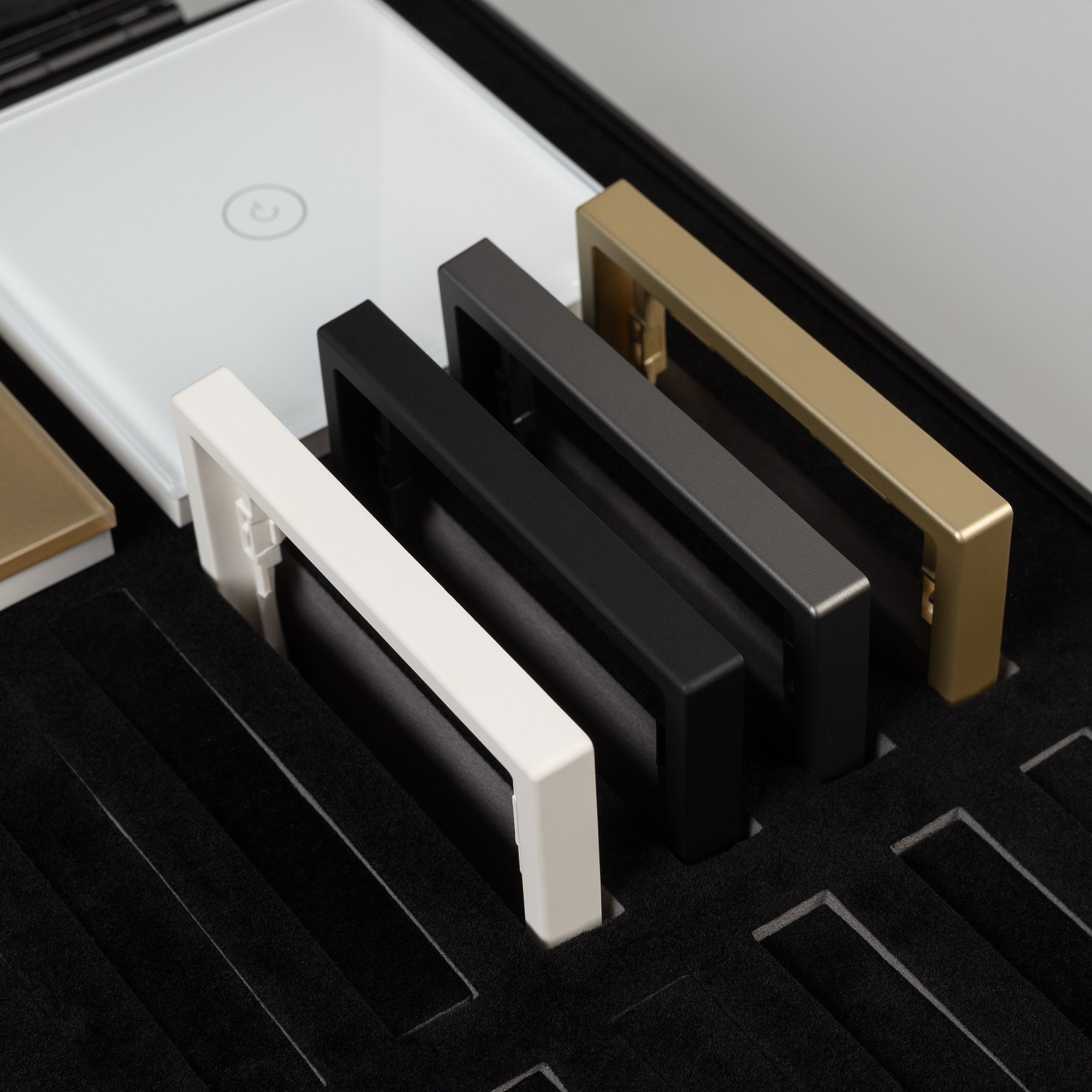 Демо-кейс с наполнением серии NOBE и OMALI. Демо-кейс содержит: Рамки серии NOBE в цветах белый, черный, золотой и серебристый (серый). Поверхность рамок имеет Soft-Touch покрытие: арт.054212 - 2шт арт.054213 - 2шт арт.054214 - 2шт арт.054211 - 2шт Механизм выключателя на одну клавишу (непроходной) в золотом цвете - арт.054253. Механизм выключателя на две клавиши с подсветкой LED (непроходной) в белом цвете - арт.054239. Механизм розетки под евровилку в черном цвете - арт.054277 Механизм розетки влагозащищенный в серебристом(сером) цвете - арт.054283 Выключатель сенсорный на одну клавишу с Zigbee управлением в белом цвете - арт.050035 Выключатель сенсорный на две клавиши с Zigbee управлением в золотом цвете - арт. 050038 Выключатель сенсорный на три клавиши с Zigbee управлением в черном цвете - арт. 050046 Розетка с Zigbee управлением в серебристом(сером) цвете - арт. 050101 Рамки представленной серии накладного типа монтажа - не требуют дополнительного оборудования для установки рамки на механизме.