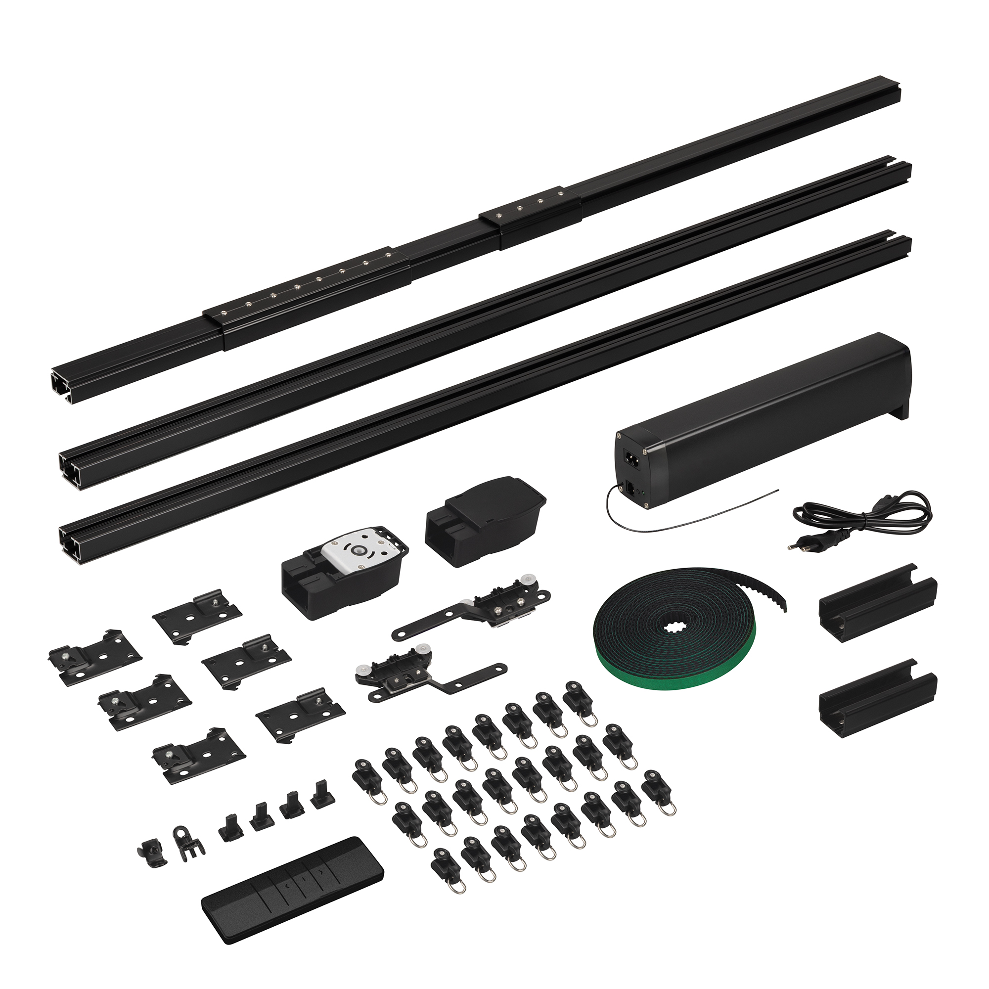 Комплект электрокарниза в черном цвете длиной до 3м (регулируется наборными частями) для раздвижных штор, состоящий из мотора, наборного алюминиевого трека, пульта и комплектующих. Электропривод с питанием 100-240В, мощность 45Вт, момент 1.2Нм, вес штор до 40кг. Управление с помощью пульта из комплекта, по WI-FI, 2.4ГГц, Bluetooth, "сухими" контактами на входе RJ11-4P4C. Совместим с платформой TUYA, АЛИСА от ЯНДЕКС. Управление со смартфона через приложение SmartLife, с помощью пульта в комплекте.