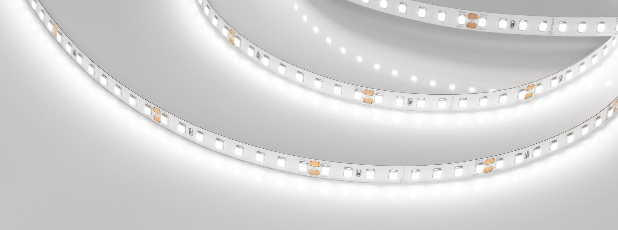 Высокоэффективная светодиодная лента RT серии A128. Напряжение питания 24 В, мощность 10 Вт/м, ширина 8 мм. Светодиоды SMD 2835, 128 шт/м, белого цвета свечения (6000K). Индекс цветопередачи CRI>85. Применяется для энергоэффективного освещения (эффективность 150 лм/Вт). Равномерная засветка больших поверхностей. Подсветка рекламных конструкций и витрин. Декоративная подсветка интерьера, потолочных ниш.