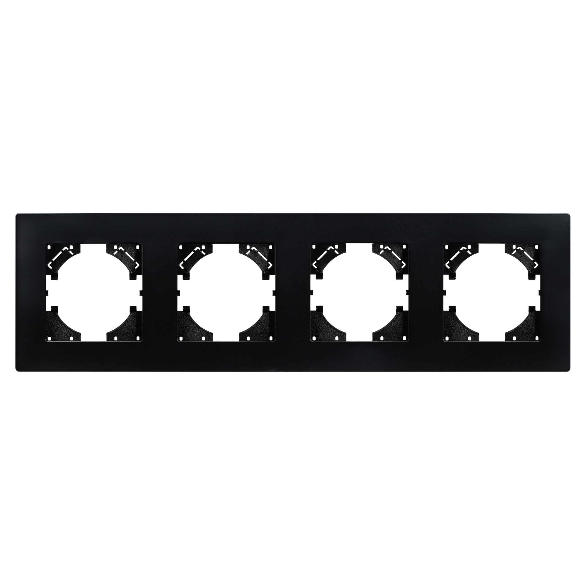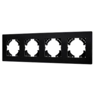 Рамка пластиковая на 4 поста, под встраиваемый механизм. Цвет - черный. Среднего уровня герметичности IP20. Ориентация монтажа - горизонтальная (основным ориентиром служат посадочные выступы для накладки механизма).