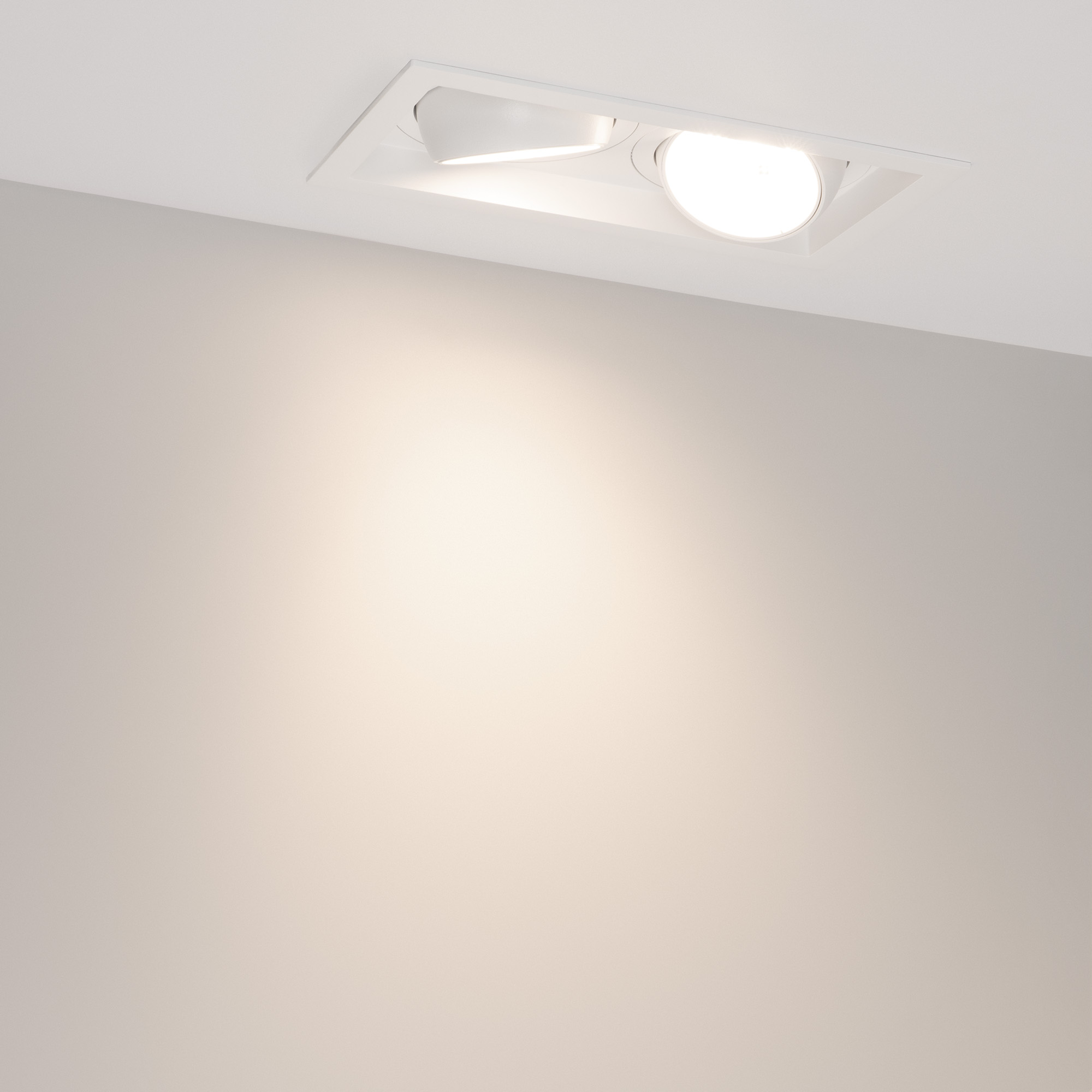 Встраиваемый карданный светильник. Мощность 2х30 Вт, св. поток 5300 лм, 88 лм/Вт, дневной 4000 K, CRI>92, угол 50°, напряжение питания 230 В. Белый корпус из алюминия, степень защиты IP20. Размер: длина 250 мм, ширина 140 мм, высота 125 мм. Монтаж встраиваемый, установочное отверстие: длина 230 мм, ширина 120 мм. Драйвер 24-42 В, 750 мА, пульсация <2%.