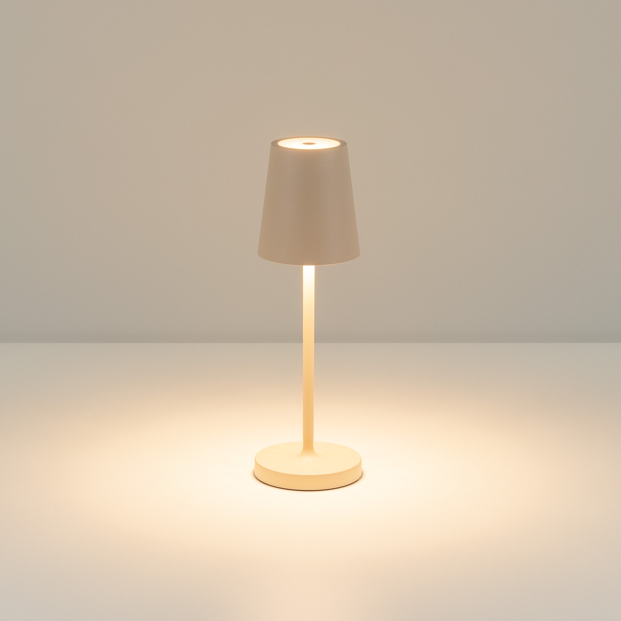 Настольный светильник со встроенным аккумулятором 1.5Вт, алюминиевый корпус, цвет песочный. Цвет ТЕПЛЫЙ БЕЛЫЙ 2200-2700-3000K, св.поток 110-130 лм, CRI(Ra)>80, угол 90°. Размер Ф75x250мм. IP54. Зарядка от сети переменного тока AC220-240V. Тип встроенного аккумулятора 1500мАч Li-ion, напряжение батареи 3.7V