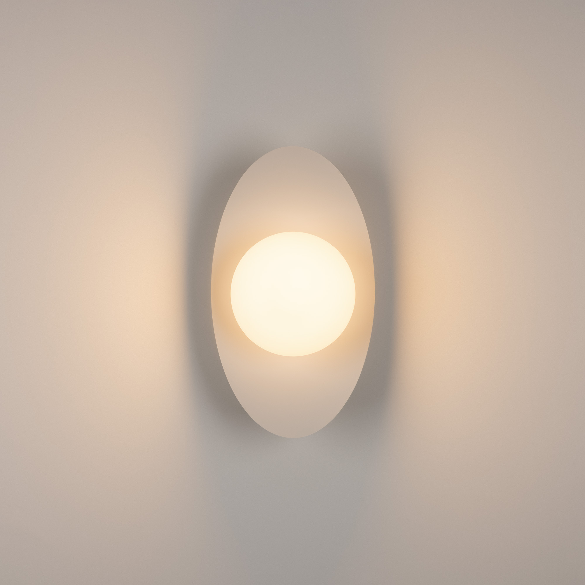 Декоративный настенный светильник. Мощность 6 Вт, св. поток 325-340 лм, 50-52 лм/Вт, теплый 2700 K,теплый 3200К, дневной 4000 K (переключаются) CRI>92, угол 150°, напряжение питания 230 В. Фигурный корпус из алюминия белого цвета, экран из матового стекла, степень защиты IP20. Размер: габариты световой части: Ø145x70 мм, габариты чаши: Ø110 x 42 мм. Монтаж накладной. Встроенный блок питания: 12В DC, 0,75 А, пульсация <2%. Встроенный диммер TOUCH-DIM.