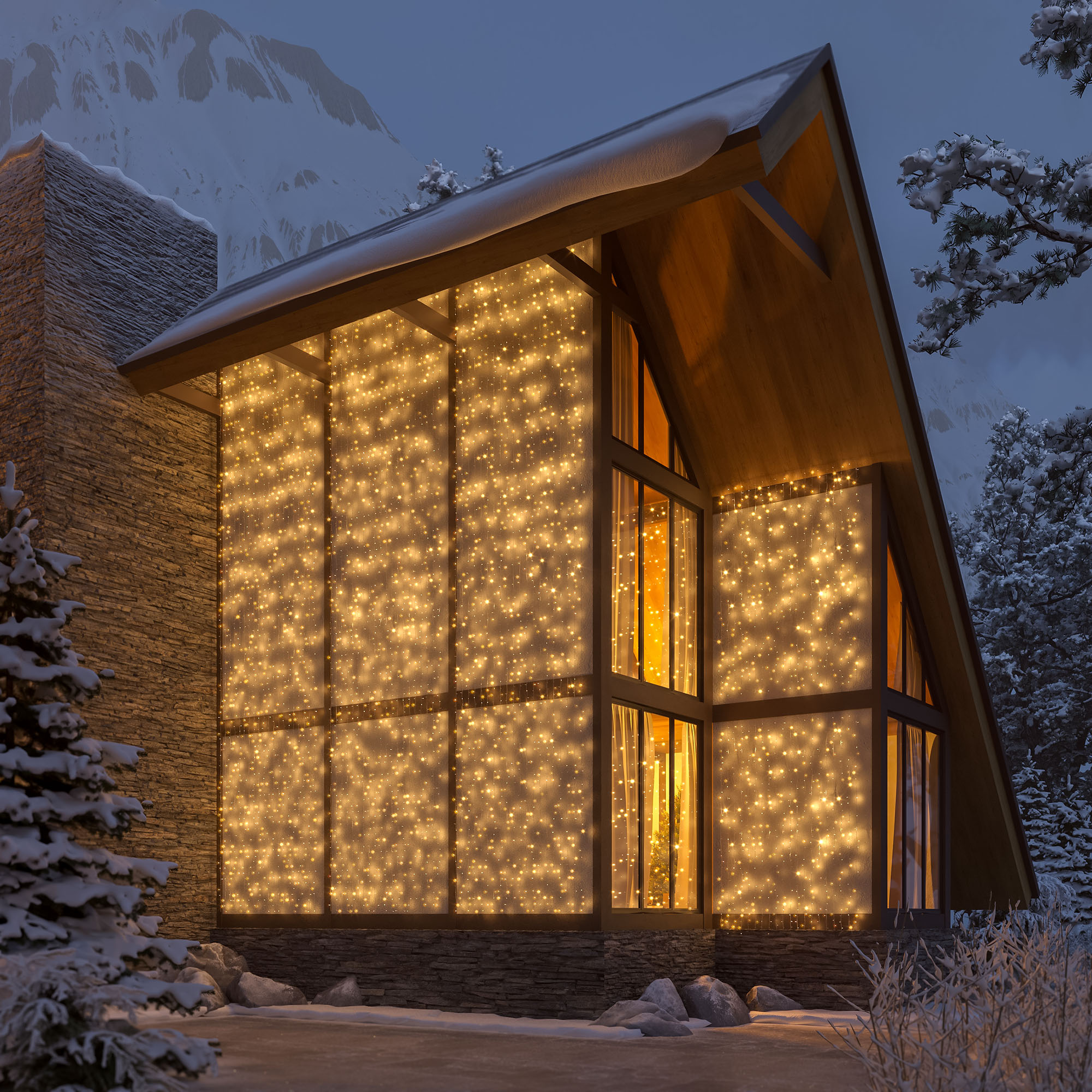Светодиодный Занавес Classic. Размер 2000x9000 мм (длина 2000 мм, высота 9000 мм). 20 ниспадающих нитей длиной 9000 мм. 2200 светодиодов размером 7 мм. Цвет свечения ТЕПЛЫЙ БЕЛЫЙ (3000 К), постоянное свечение и 8 динамических эффектов с резким световым рисунком (прозрачная вогнутая линза). Провод прозрачный, ПВХ. Питание 230 В, Мощность 120 Вт, защита IP65, применение в помещении и на улице под навесом. Аксессуар для подключения и выбора режима свечения в комплекте.